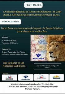 A OAB/ Barra da Tijuca, por meio da sua Comissão de Direito Tributário e da OAB / Jovem realizará, no dia 28 de março, às 15h, um importante evento com Auditores da Receita Federal do Brasil e especialistas em tributação para tirar dúvidas de Imposto de Renda para não cair na “MALHA FINA”.