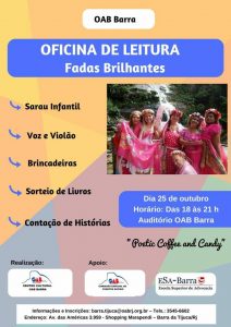 Não percam a próxima Oficina de Leitura do Centro Cultural OAB/Barra da Tijuca: Especial em Comemoração ao Dia da Criança,  que acontecerá na última quarta-feira deste mês , no dia 25 de outubro,  das 18h às 21h, no Auditório da 57ª Subseção do Estado do Rio de Janeiro , localizada na Avenida das Américas, 3959, Sala 222 – Barra da Tijuca, Shopping  Marapendi, Barra da Tijuca  – RJ  (em frente a Estação do BRT Parque das Rosas).