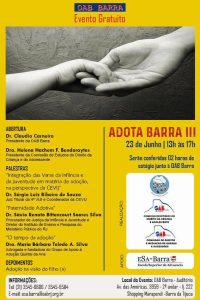 O evento, que tem parceria com a Comissão de Direitos da Criança e do Adolescente e com o Grupo Semeando Sonhos, acontecerá dia 23/06 , das 13h às 17h, no auditório OAB/ Barra da Tijuca ( 57ª Subseção do Estado do Rio de Janeiro), onde haverá mais uma tarde de palestras.
